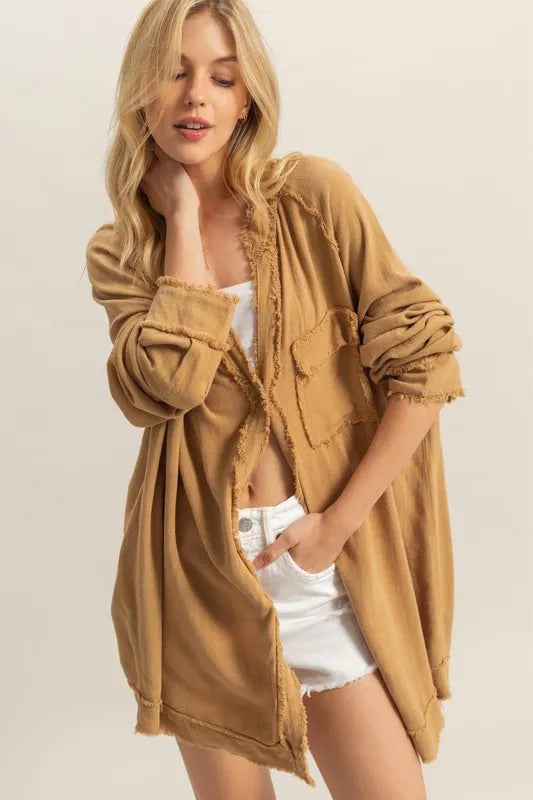 This Raw Edge Button Down Raglan Sleeve Shirt features a unique design with raw edges for a trendy look. The button-down style adds a classic touch, while the raglan sleeves provide a comfortable fit. Made from high-quality materials, this shirt is both stylish and comfortable, making it a versatile addition to your wardrobe.