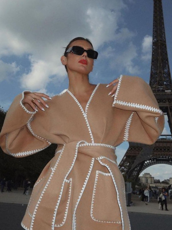 Chaqueta tipo cárdigan con cuello en V y cordones y diseño de cinturón con encaje