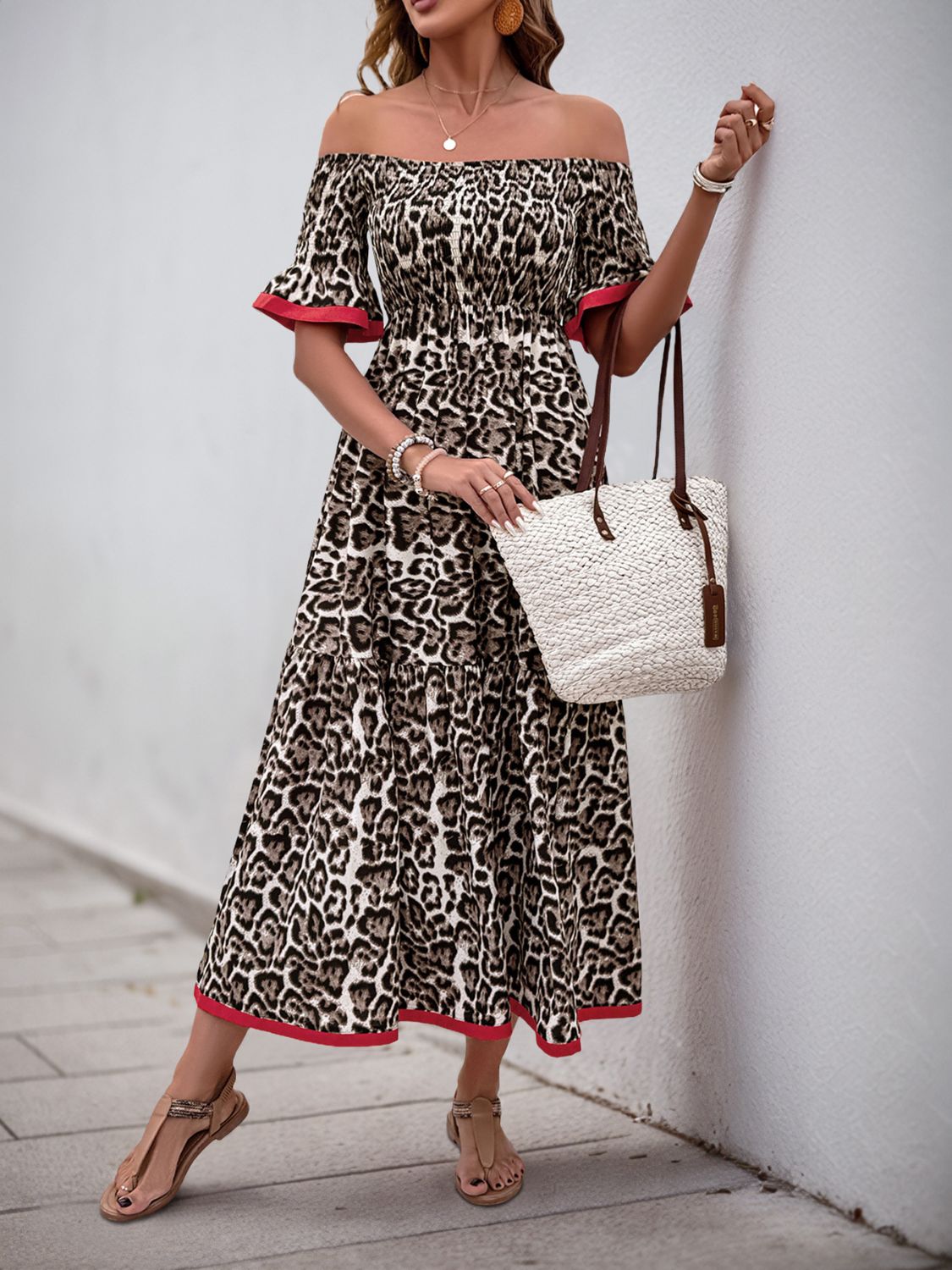 Leopard Off-Shoulder Flounce Sleeve Midi Dress