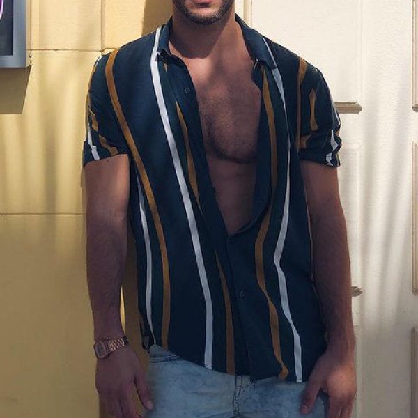 Men Striped Color Block Contrast Print Short Sleeve Shirts For Men
